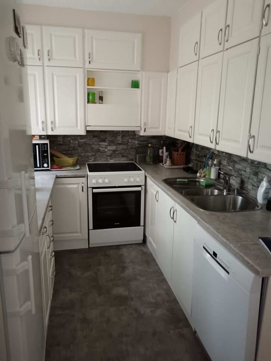 | Keittiön varustus | Jääkaappi ja pakastin: jääkaappi/pakastin Tasot: muu Seinät: maalattu Lattia: vinyyli Muut varusteet: astianpesukone, liesituuletin / hormi Liesi/uuni: sähköliesi |