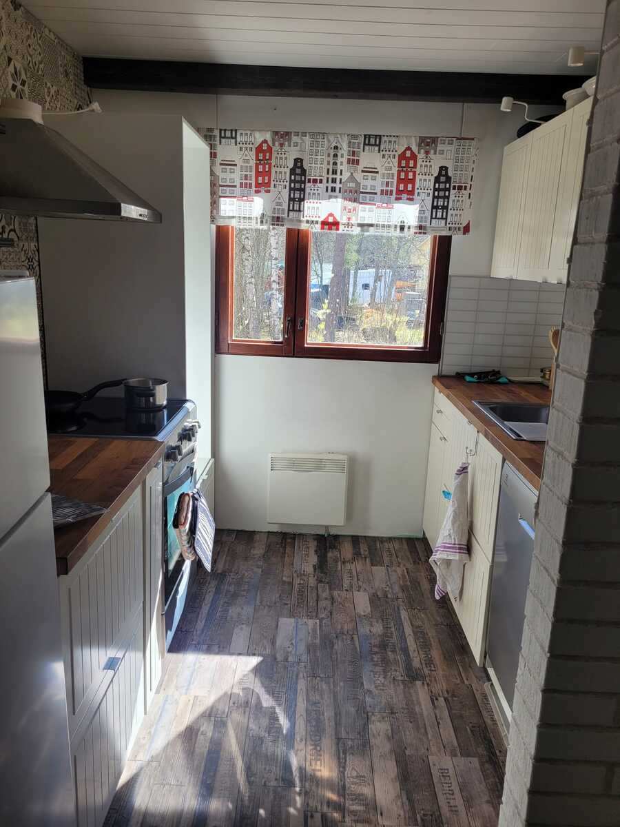 | Keittiön varustus | Jääkaappi ja pakastin: jääkaappi/pakastin Muut varusteet: liesituuletin Seinät: maalattu, puu Lattia: laminaatti Liesi/uuni: keraaminen |