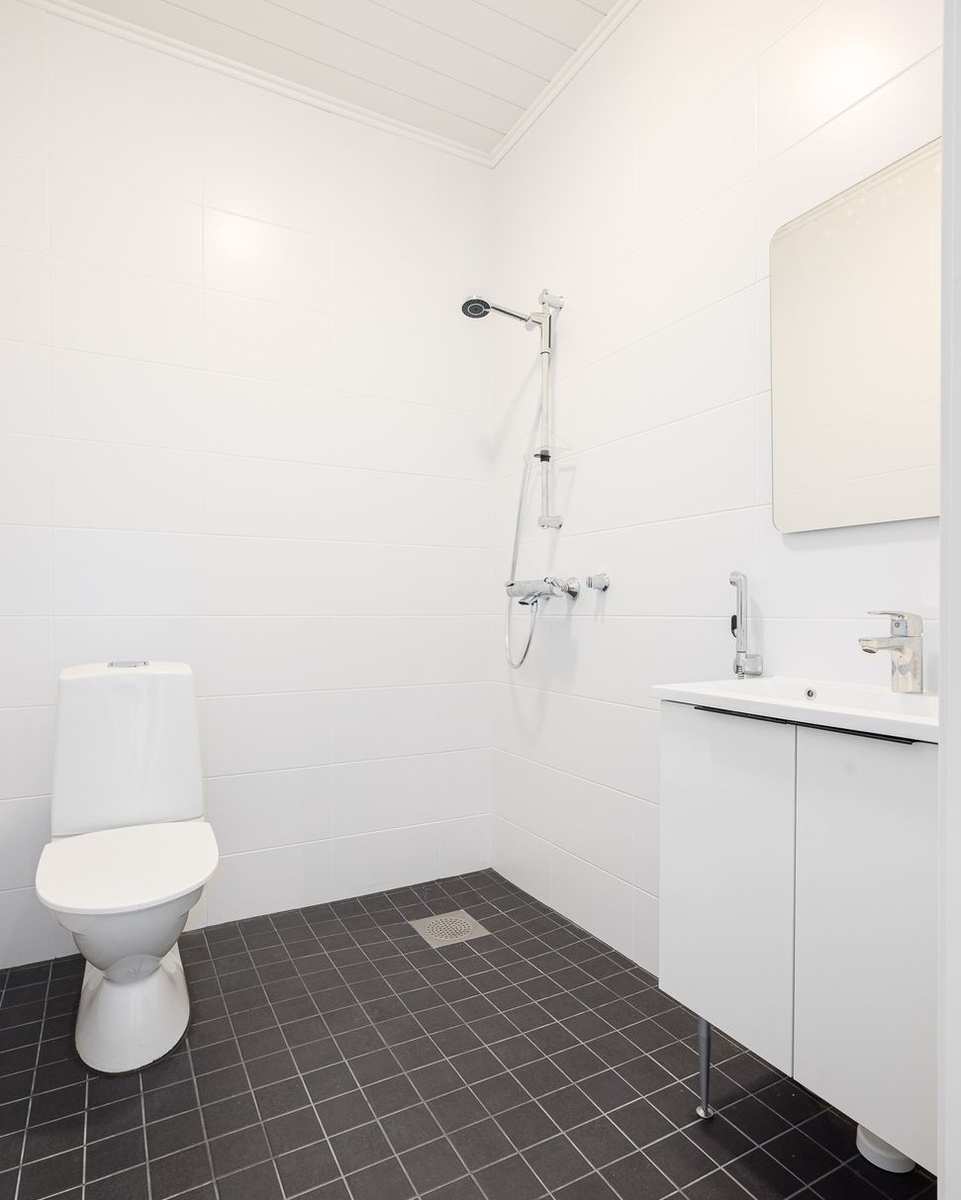 | Kylpyhuone | Varusteet: pesukoneliitäntä, lattialämmitys, wc-istuin, suihku, peilikaappi Seinät: kaakeli Lattia: laatta |