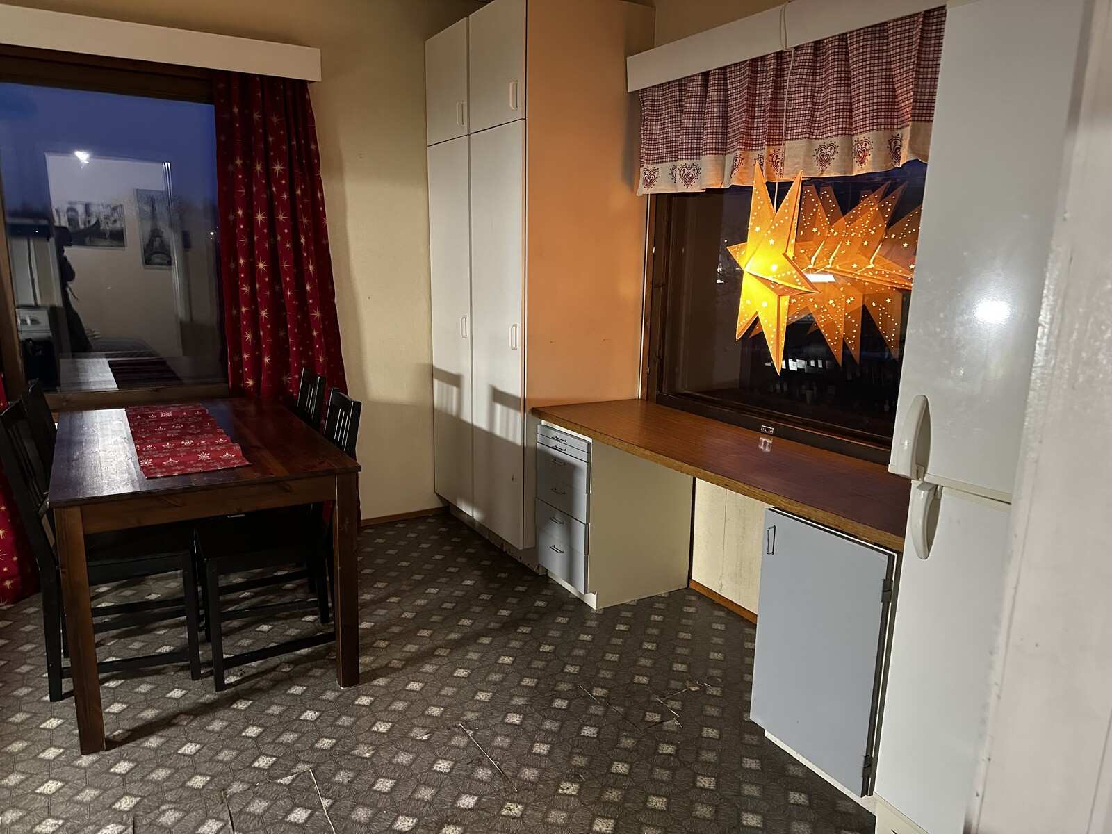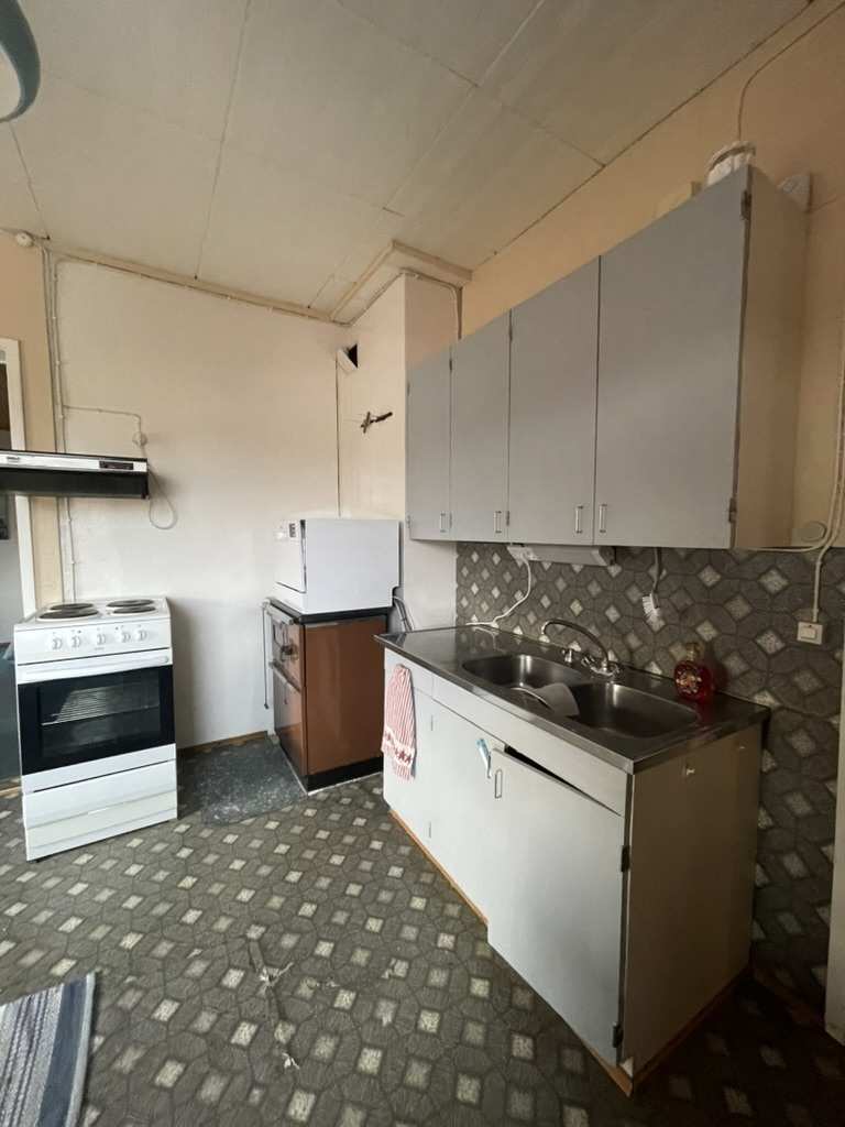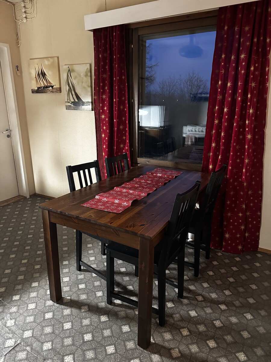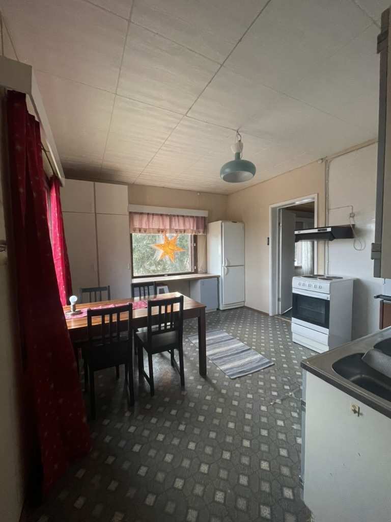 | Keittiön varustus | Jääkaappi ja pakastin: jääkaappi/pakastin Muut varusteet: liesituuletin Seinät: maalattu Lattia: muovi Liesi/uuni: sähköliesi |