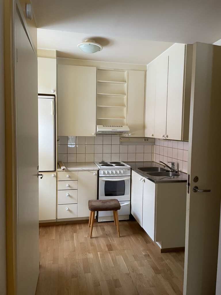 | Keittiön varustus | Jääkaappi ja pakastin: jääkaappi/pakastin Muut varusteet: liesituuletin Tasot: laminaatti Seinät: maalattu Lattia: parketti Liesi/uuni: sähköliesi |