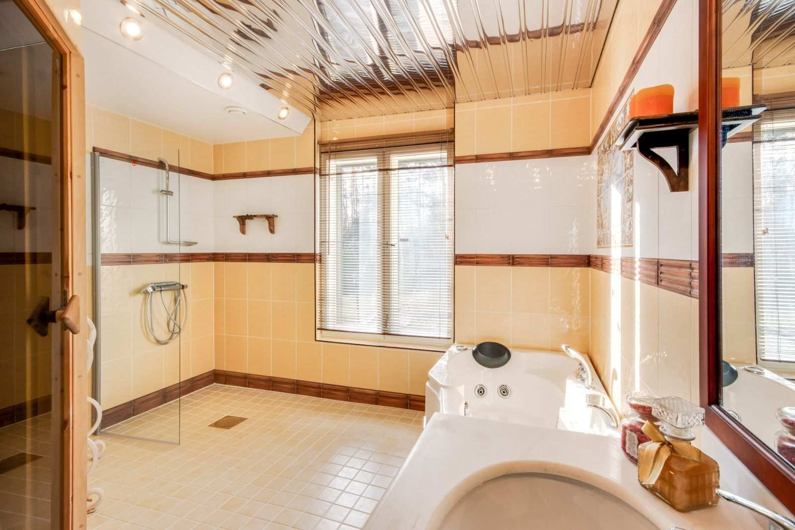 | Kylpyhuone | Varusteet: poreamme, lattialämmitys, suihku, kylpyhuonekaapisto Seinät: kaakeli Lattia: laatta |