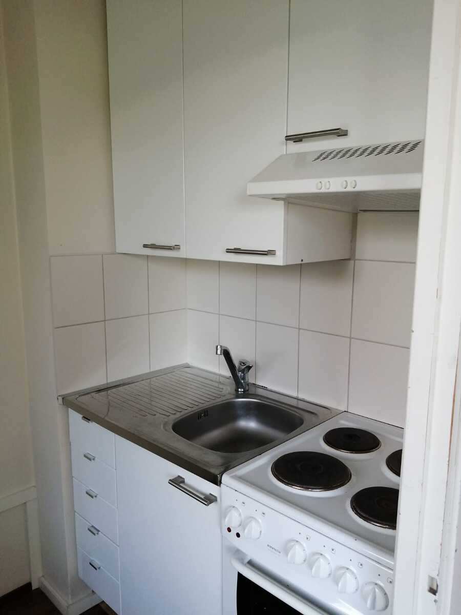 | Keittiön varustus | Jääkaappi ja pakastin: jenkkikaappi Muut varusteet: liesituuletin Seinät: maalattu Lattia: laminaatti Liesi/uuni: sähköliesi |