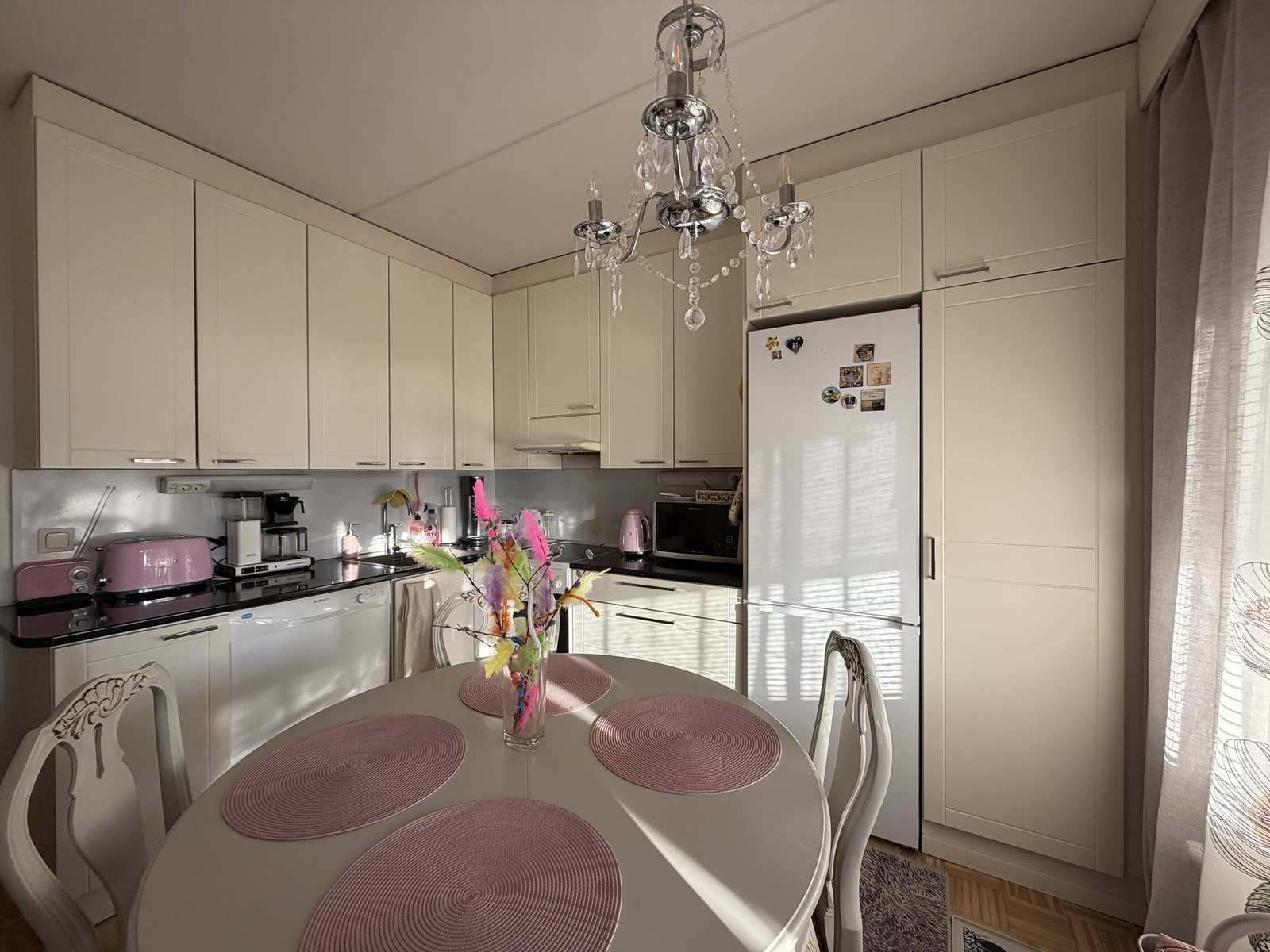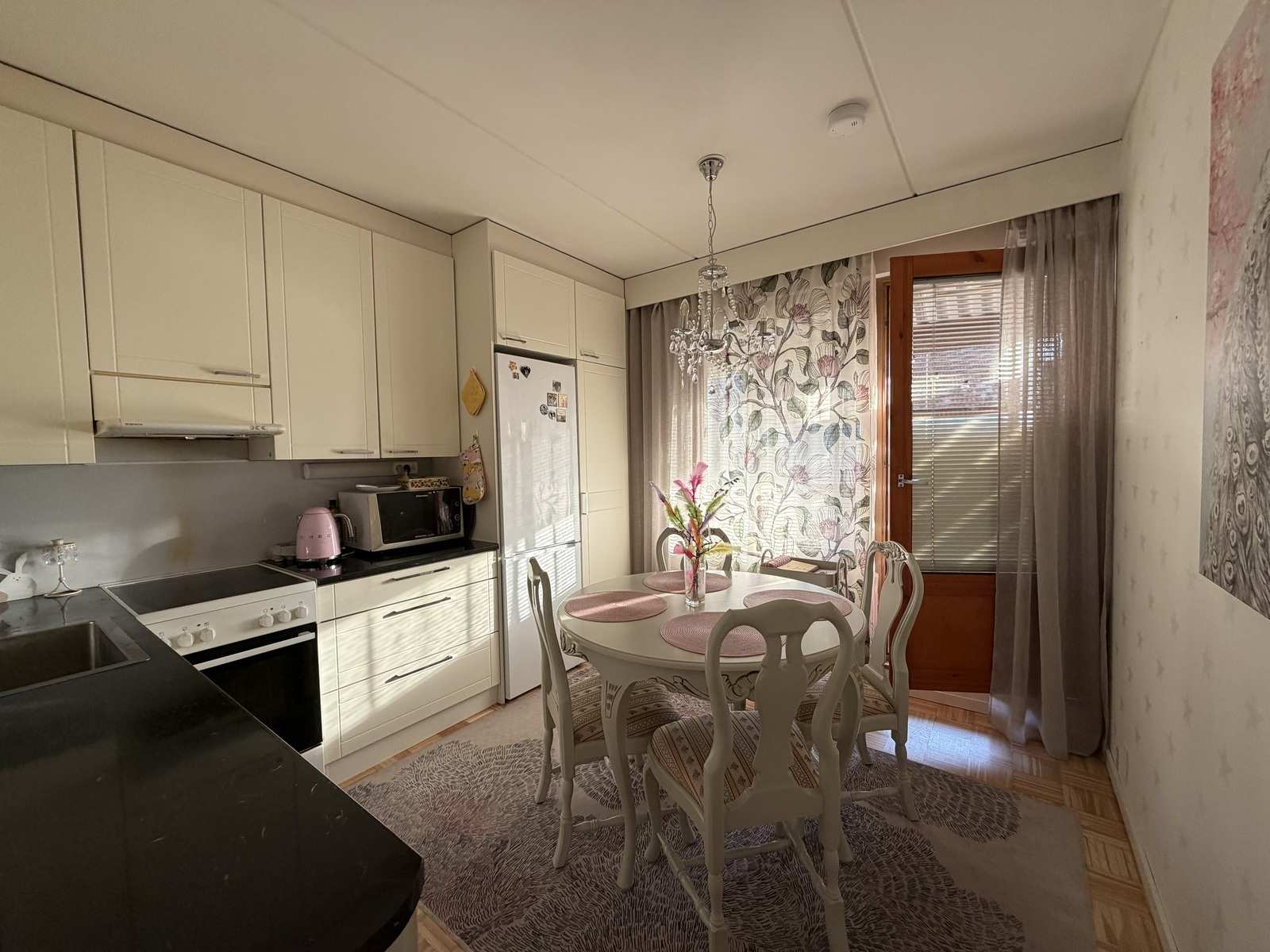 | Keittiön varustus | Jääkaappi ja pakastin: jääkaappi/pakastin Muut varusteet: liesituuletin, astianpesukone Seinät: maalattu Lattia: parketti Liesi/uuni: keraaminen |