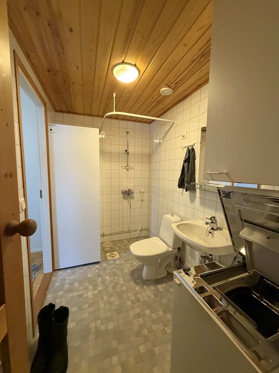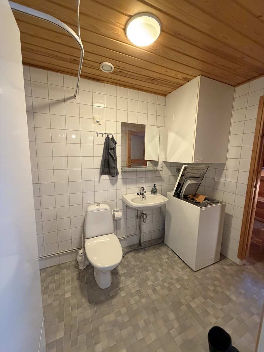 | Kylpyhuone | Varusteet: pesukoneliitäntä, lattialämmitys, wc-istuin, suihku, peili Seinät: kaakeli Lattia: laatta |
