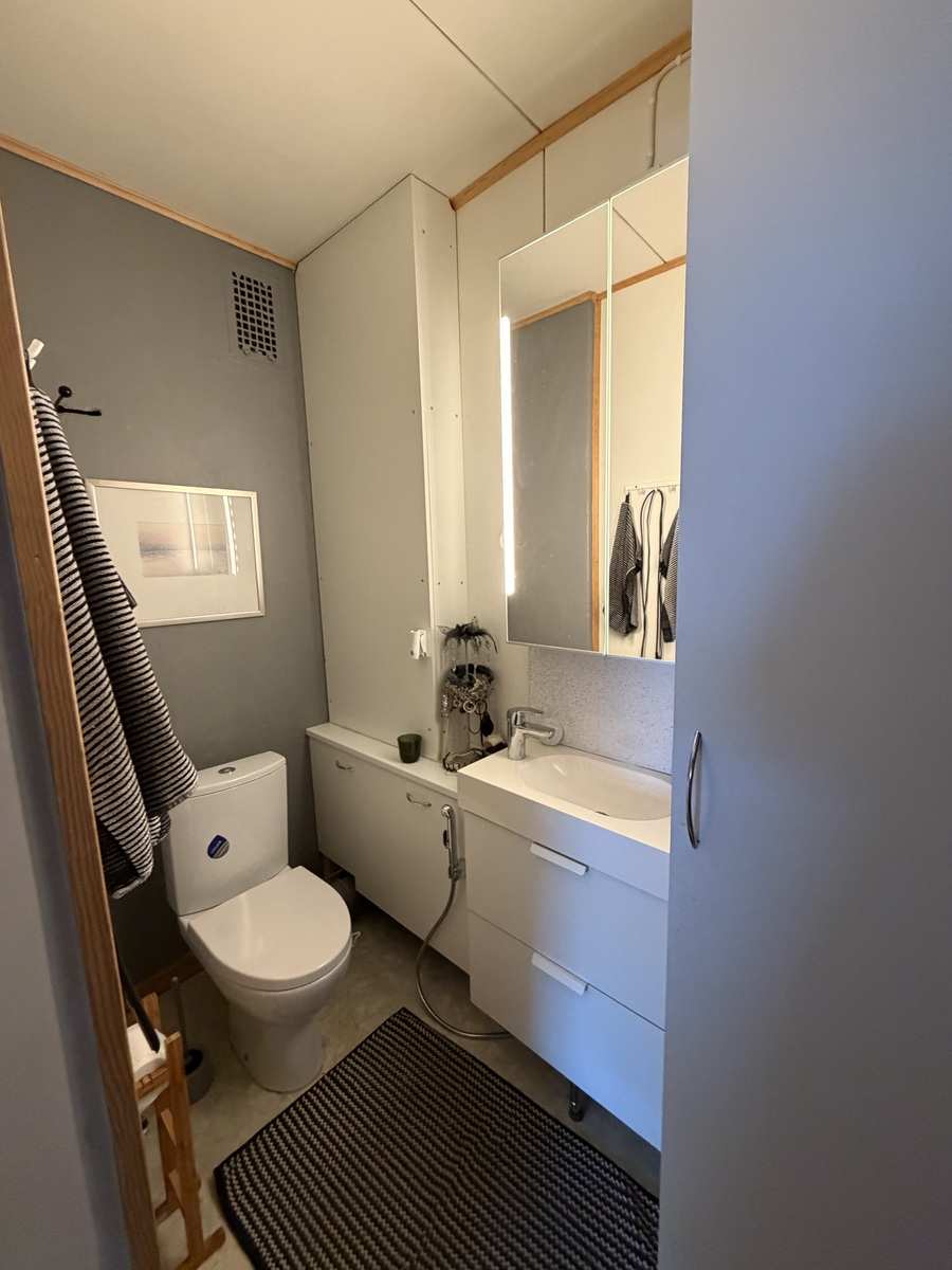 | Erillinen WC | Lattia: laatta, muovi Varusteet: peilikaappi, bidee-suihku Seinät: maalattu Lukumäärä: 2 |
