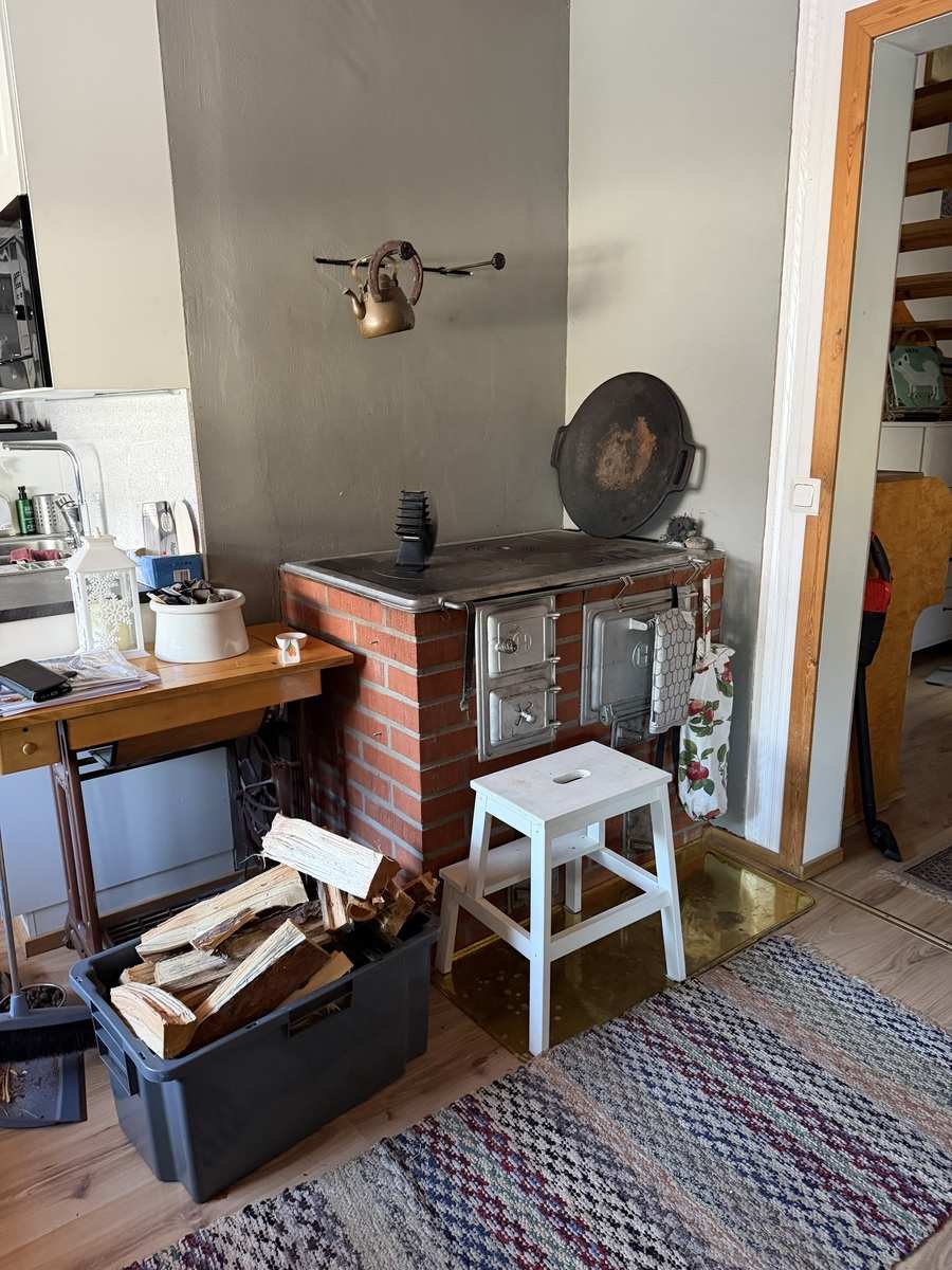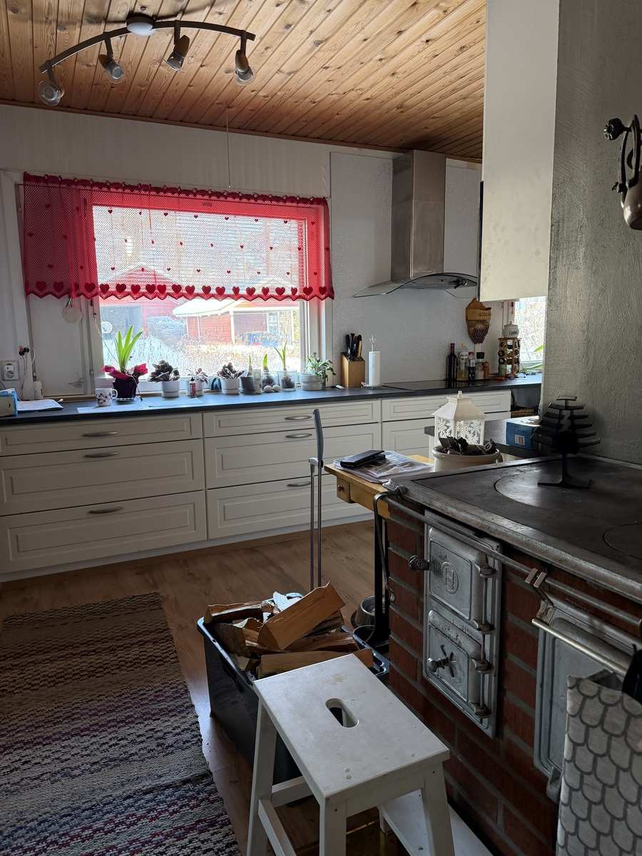 | Keittiön varustus | Jääkaappi ja pakastin: jääkaappi/pakastin Tasot: laminaatti Seinät: tapetti Lattia: laminaatti Muut varusteet: liesikupu, liesituuletin, astianpesukone Liesi/uuni: sähköliesi, puuliesi |