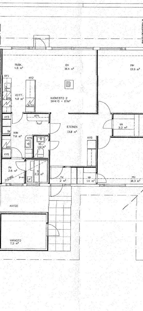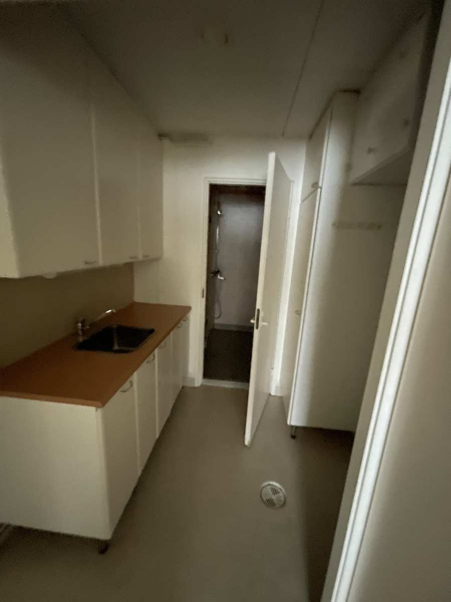 | Kodinhoitohuone | Seinät: maalattu, tapetti Varusteet: pesukoneliitäntä, lattiakaivo, pyykkikaapit, pöytätaso Lattia: muovi |