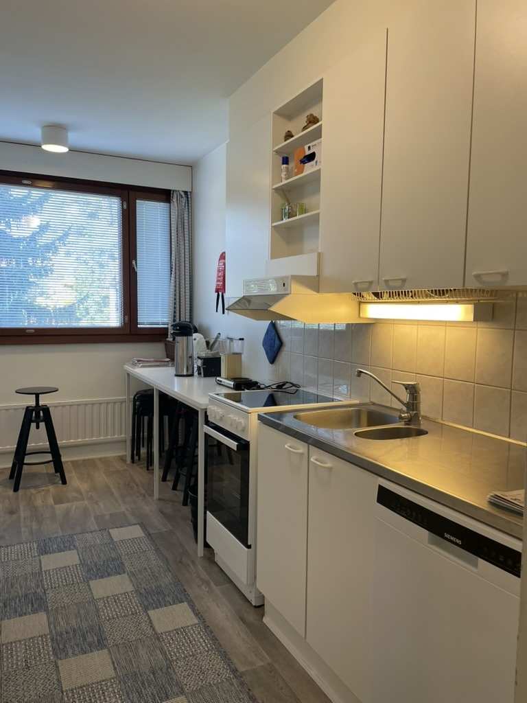 | Keittiön varustus | Jääkaappi ja pakastin: jääkaappi/pakastin Muut varusteet: liesituuletin, astianpesukone Seinät: maalattu Lattia: muovi Liesi/uuni: keraaminen |
